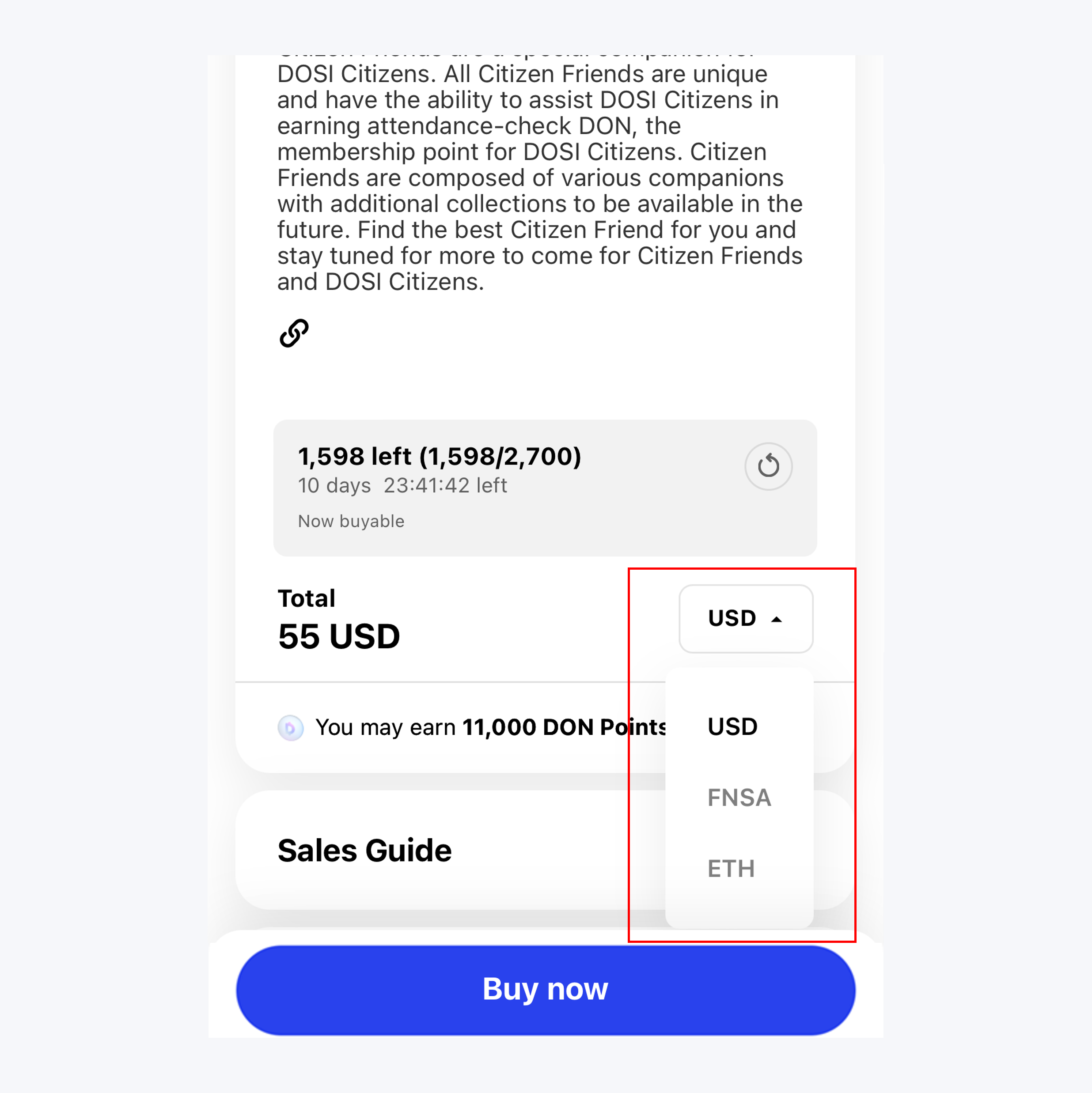 Select the item you wish to purchase and press 'Buy' after choosing your preferred payment currency.